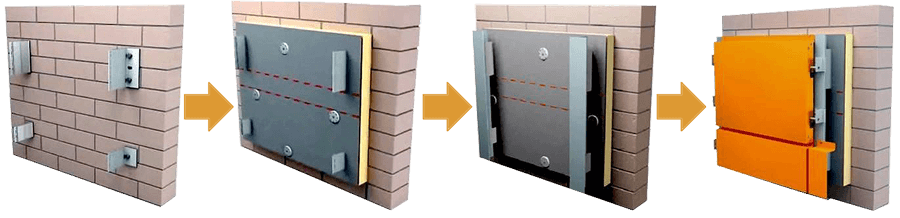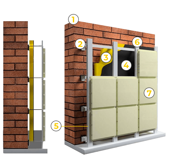 Ventilējamā fasāde sākas ar nesošo ārsienu, pie kuras tiek montēti fasādes L veida leņķi no alumīnija vai cinka. Konstrukciju var veidot arī no koka karkasa. Pie ārsienas ar dībeļiem tiek stiprināta viena līdz trīs slāņu bieza siltumizolācija. Atkarībā no tehnoloģijas liek arī pretvēja plēvi, ja tā nav jau piestiprināta siltinājumam. Virs siltinājuma tiek stiprināti T veida profili, kas izlīdzina plakni un veido atstarpi starp siltinājumu un apdari. Visbeidzot, tiek veidota fasādes apdare uz koka, cementa, keramikas vai metāla bāzes.